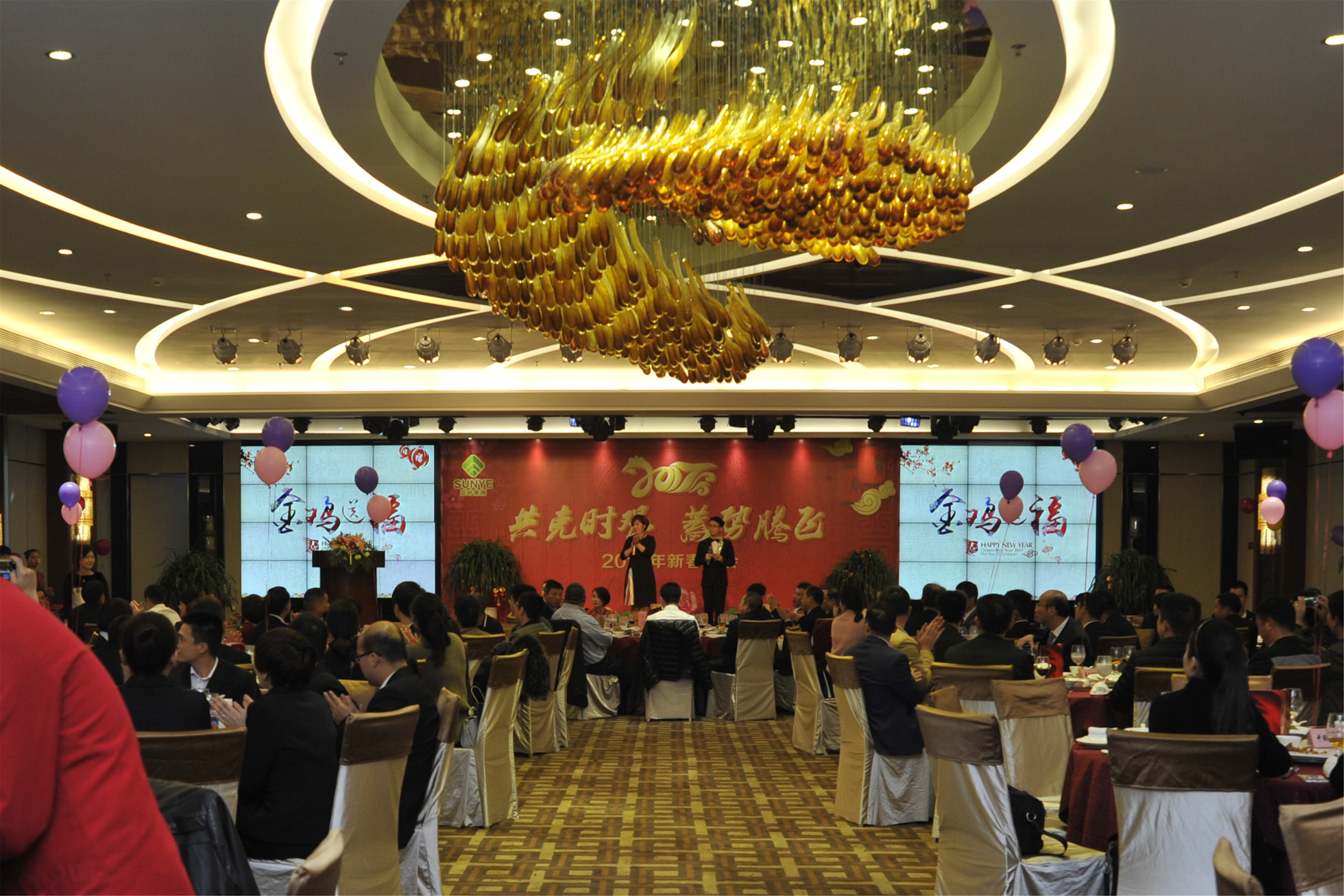 三葉集團2017年新春晚宴作者: 來源: 時間:2017-2-5 23:16:35 大圣鳴金辭舊歲;雄雞唱曉慶新春。2017年2月5日晚(農歷正月初九),三葉集團在華僑大酒店五樓宴會廳隆重舉行以“共克時艱·蓄勢騰飛”為主題的2017年新春晚宴。三葉集團公司總部全體員工,海西股份、高時物流、旅游系統、海聯公司、酒店管理公司、海峽生態園、北京公司、重慶公司、廈門公司等下屬各公司管理層,及特邀嘉賓歡聚一堂,共同分享收獲果實的喜悅,祝福無限美好的未來。