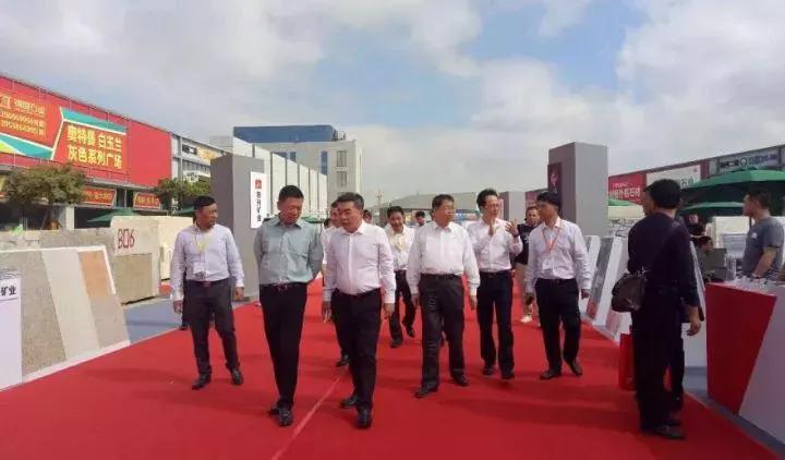福建省經濟和信息化委員會副主任郭學軍,中共南安市委書記王春金,南安市市長林榮忠,南安市常務副市長黃輝燦,南安市常委紀委書記李巖華,南安市人民政府副市長陳洪春,水頭鎮黨委書記柯曉輝,水頭鎮人民政府鎮長蔡清安,南安市經濟和信息化委員會主任林良泉,泉州市石材工業協會會長王尚云,南安市石材工業協會會長王清安等領導在海西物流股份有限公司副總經理陳少健等人陪同下,參觀了海西國際石材荒料展,并詳細詢問了參展荒料的產地、質地。隨后,還參觀了海西石材城奢石館,在美好石代展館里,王春金表示,石材與光電的結合,更加充分地展現了石材背景墻的光澤度、色澤度,這種石材創新模式是值得肯定的。