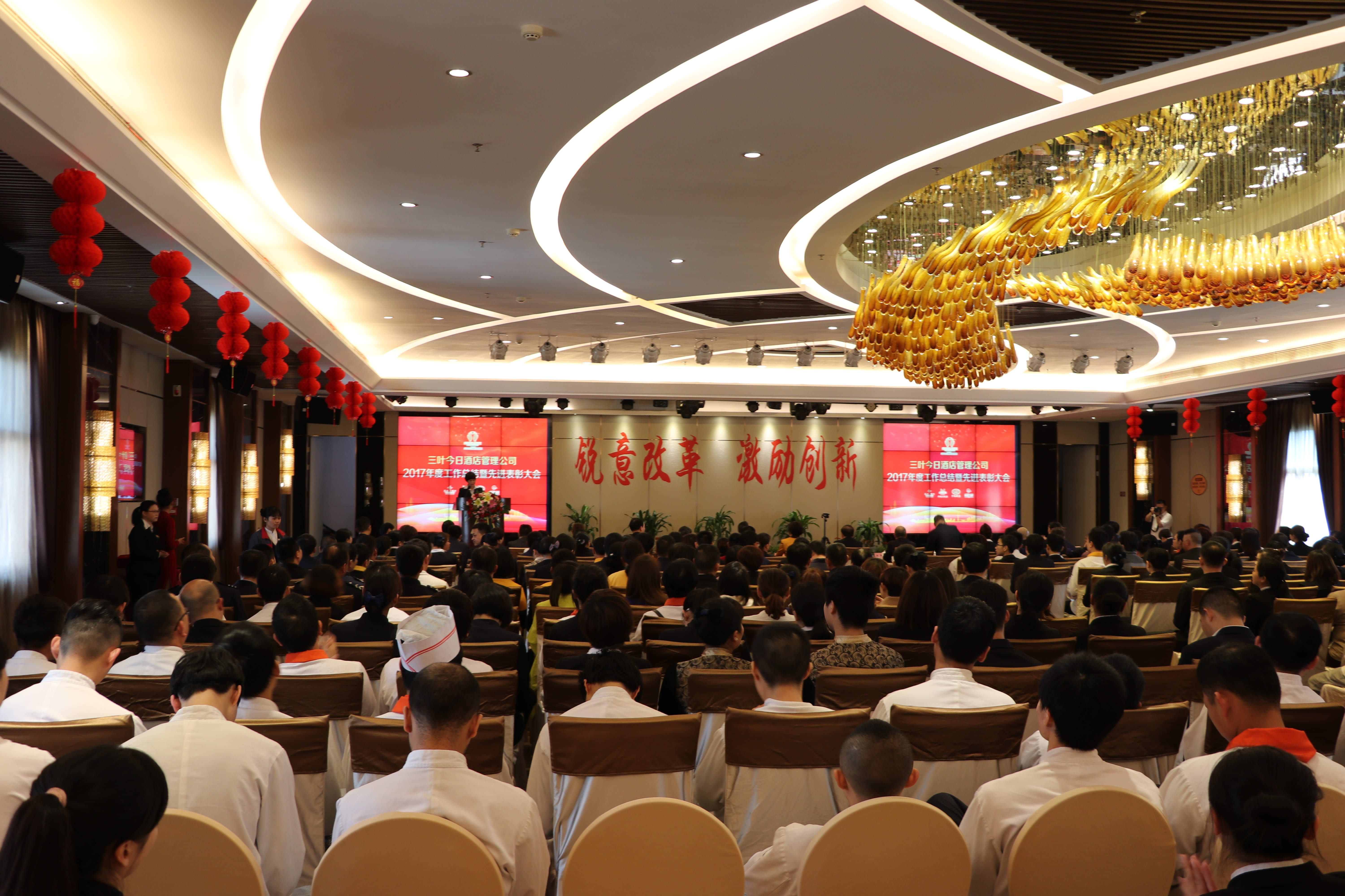 三葉今日(福建)酒店管理有限公司2017年度總結表彰大會作者: 來源: 時間:2018-4-11 14:54:36 3月16日下午2:30,三葉今日(福建)酒店管理有限公司(以下簡稱酒管公司)2017年度總結表彰大會在華僑大酒店5F多功能廳隆重舉行。參加本次大會的有酒管公司領導、各成員酒店(分公司)人員以及2017年度先進個人、集體共三百余人。